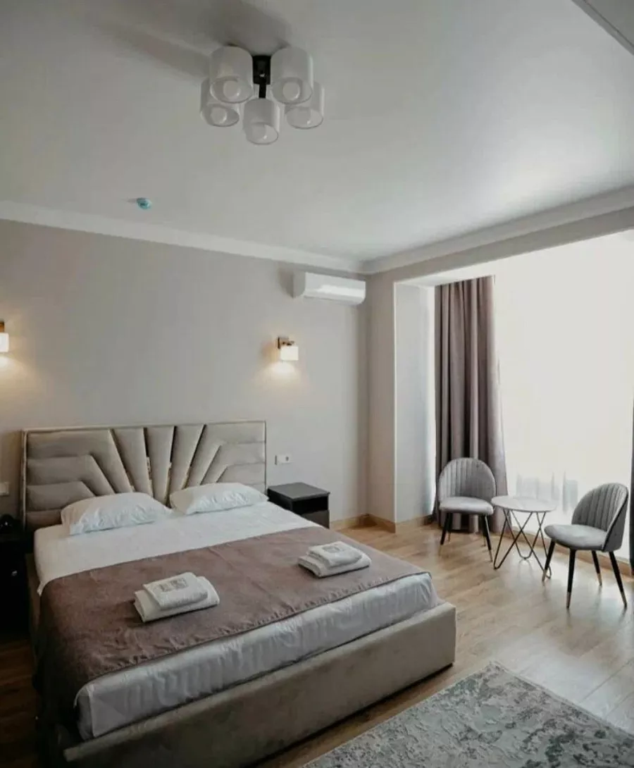 В первый день нас встретили на вокзале и отвезли в гостиницу. Так как мы приехали раньше времени заселения, нам предложили оставить вещи и прогуляться. Гостиница находилась в центре Махачкалы, поэтому мы успели и позавтракать, и сходить на море. Позже заселились в чистый номер с прекрасным видом: с одной стороны — море, с другой — горы.