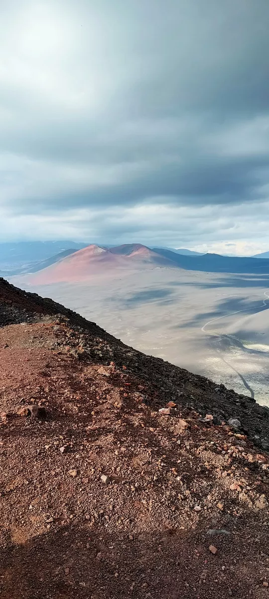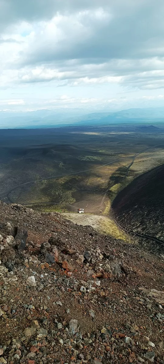 Инструктаж. Подъем на склон вулкана Плоский Толбачик до 1800-2000 м (около 3 часов). Подъема до этой высоты достаточно, чтобы не тратить лишние силы и вдоволь насладиться панорамой на весь Толбачинский Дол, распаханный огромными потоками уже застывшей лавы и засыпанный огромным слоем шлака на десятки километров вокруг.