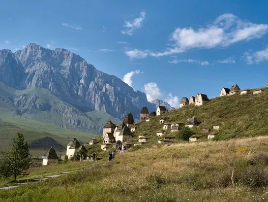 Наш путь пройдёт через город мёртвых Даргавс. Узкие проёмы, полное отсутствие окон с первых секунд вызывает огромный интерес у туристов. Но во время беседы становится понятно, почему сооружения имеют такой вид. Даргавс - это самый знаменитый некрополь на Кавказе, который стоит на склоне более 700 лет. В общей сложности тут около 100 склепов, в которых похоронено примерно 10 тысяч человек. Место поистине загадочное, так как здесь сухо даже осенью и зимой, а ясная погода практически круглый год.