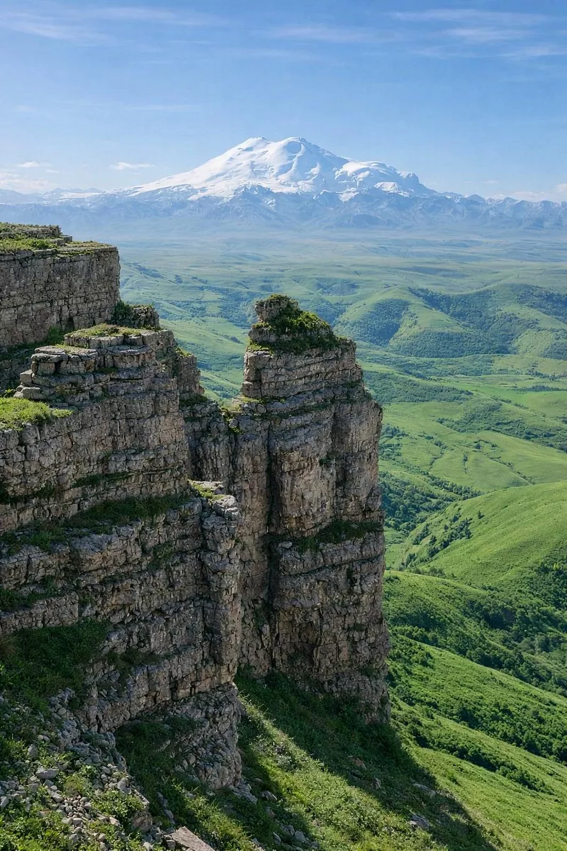 Тёмно-изумрудные равнины предгорий уходят к линии горизонта. В ясную погоду над всей панорамой поднимается массив Эльбруса.
