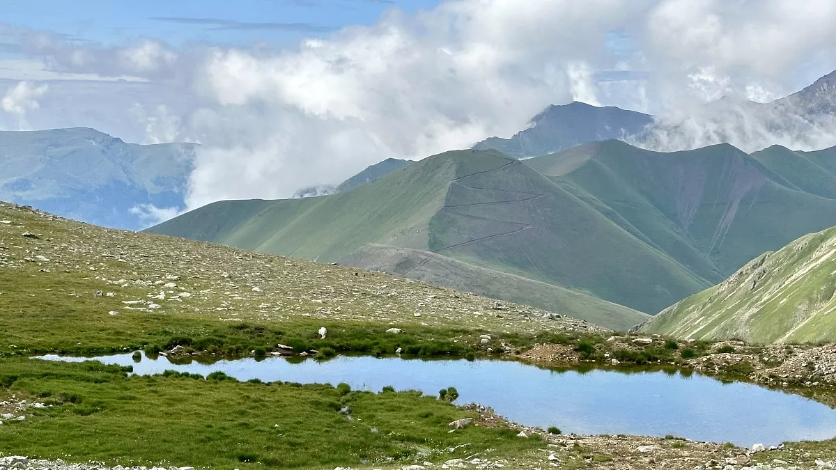 Дорога проходит по травянистым склонам, где пасутся лошади и овцы среди альпийских цветов, и переходит в каменные участки с россыпями породы. По пути делаем фотоостановки.