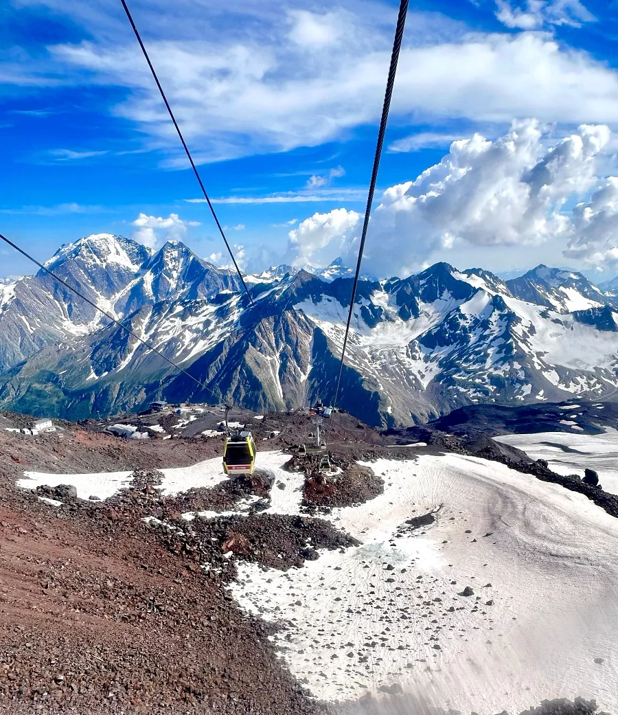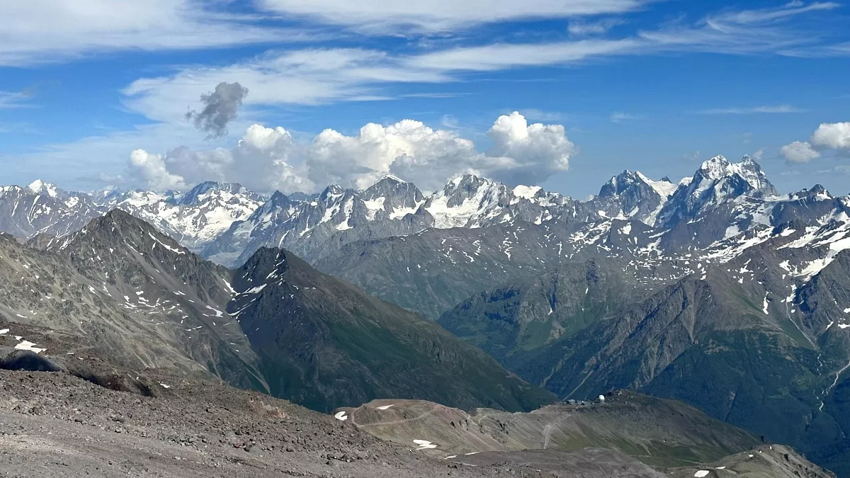 Верхняя станция - 3847 м. Панорама Центрального Кавказа: снежные вершины, ледовые поля и лавовые породы древнего вулкана.