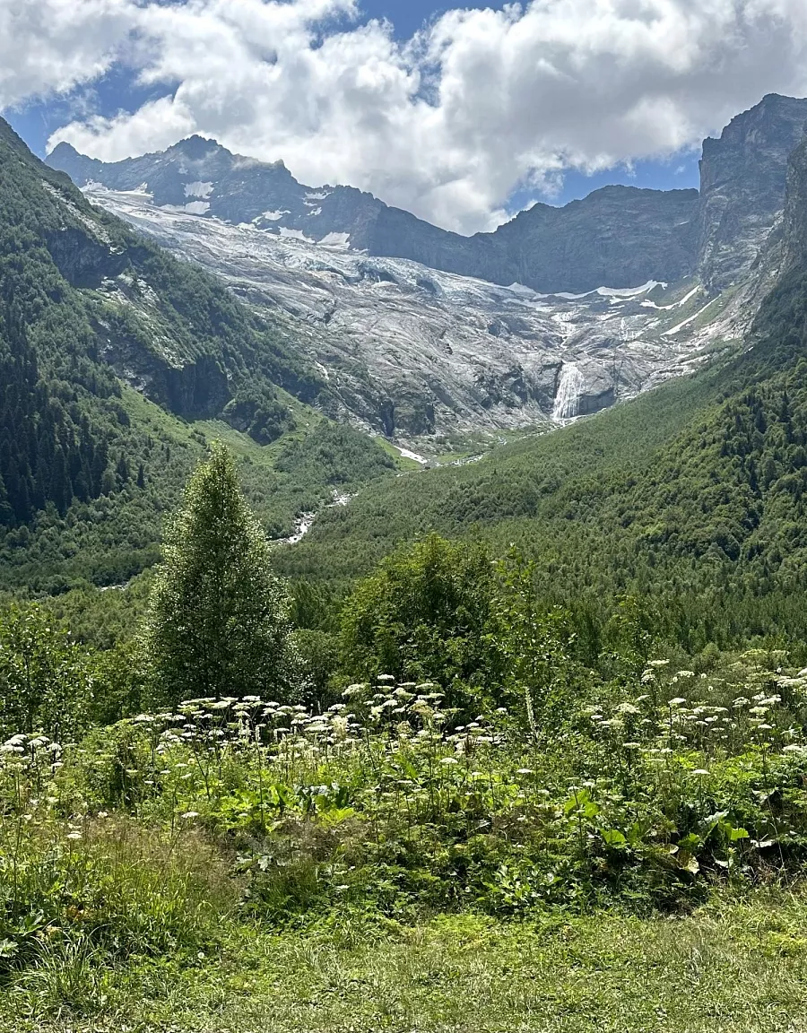 Отсюда открывается вид: вершины поднимаются резкими гребнями, на склонах лежат голубые ледники, в разломах виден лёд. Со скальных уступов срываются длинные нити водопадов. Туман поднимается из ущелий и заполняет пространство между хребтами. В ясную погоду солнце подчёркивает рельеф.