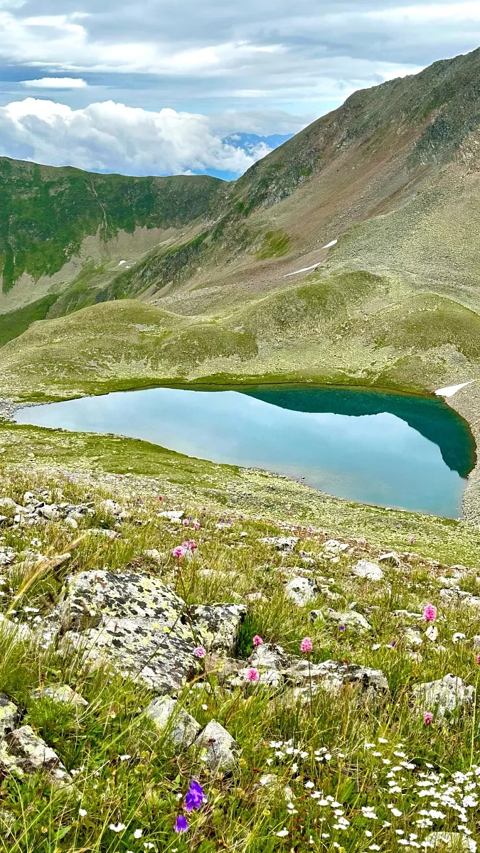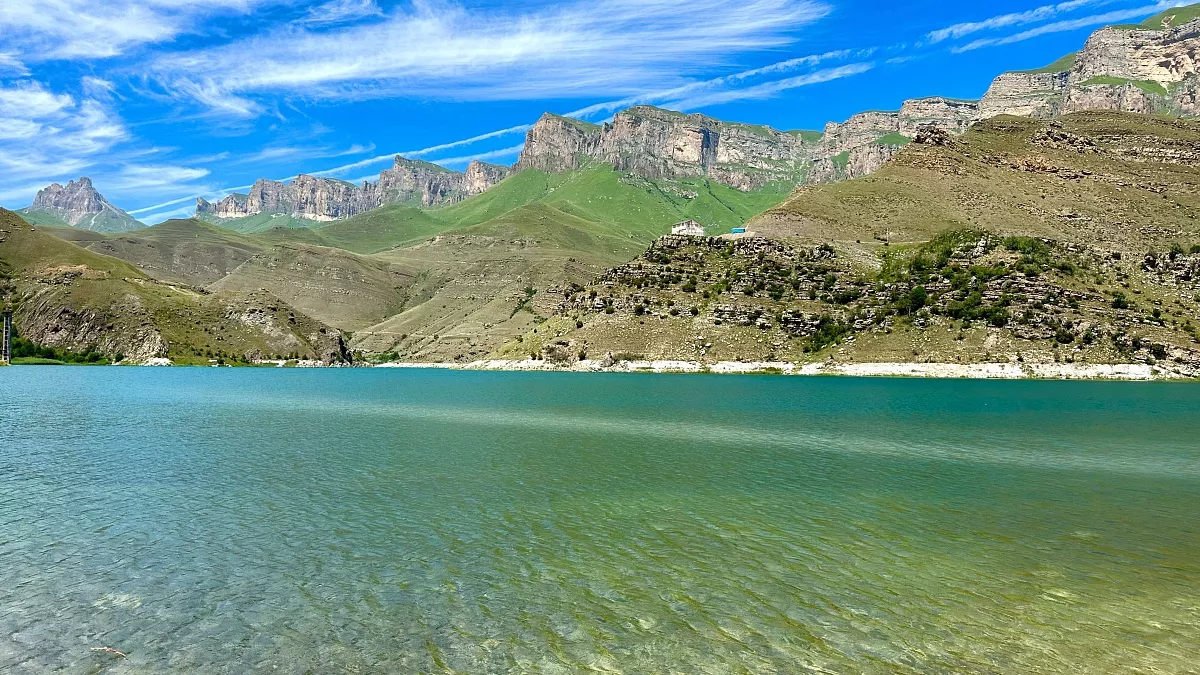 Выезд в горы. Первая остановка - озеро Гижгит. Голубовато-зелёный оттенок воды связан с минеральными частицами в породе. Озеро лежит в узкой чаше между крутыми склонами.
