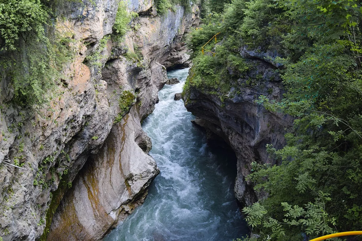 Экскурсия в Хаджохскую Теснину. Уверяем, от впечатлений при посещении теснины Вы испытаете необычайный восторг. Здесь мощная река Белая умещается в 3-5 метровый проем. Что тут происходит во время весеннего таяния снегов рассказать нельзя. Но можно представить. А лучше приехать и самим услышать голос реки, которую скала пытается заковать в каменные наручники. ВАЖНО! В теплое время года для активных туристов есть альтернатива экскурсиям сплав по реке Белой!
