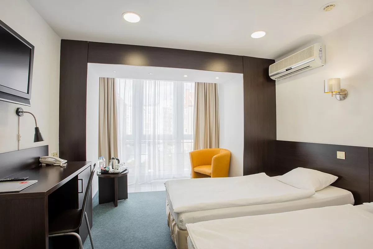 Двухместный стандарт: панорамный вид из окна во внутренний двор – стоянка — озеро «Верхнее», номер оборудован гарнитурной мебелью (письменный стол, стул, вешало с зеркалом, тумба для багажа, шкаф), двумя стандартными кроватями. В лоджии расположена кофе-зона – журнальный столик, кожаное кресло. Санузел оборудован современной душевой кабиной, подвесным унитазом, раковиной, зеркалом, феном, туалетными принадлежностями, комплектами полотенец; бесплатный Wi-Fi, система кондиционирования, сейф, мини-холодильник, телевизор, телефон, фен.