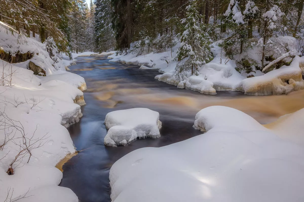 На реке Иййоки есть четыре невысоких, но очень фотогеничных водопада. Река течет по тайге с огромными елями, ее русло зажато высокими берегами. Спуск в долину оборудован лестницей, а берег - настилами и мостиками.