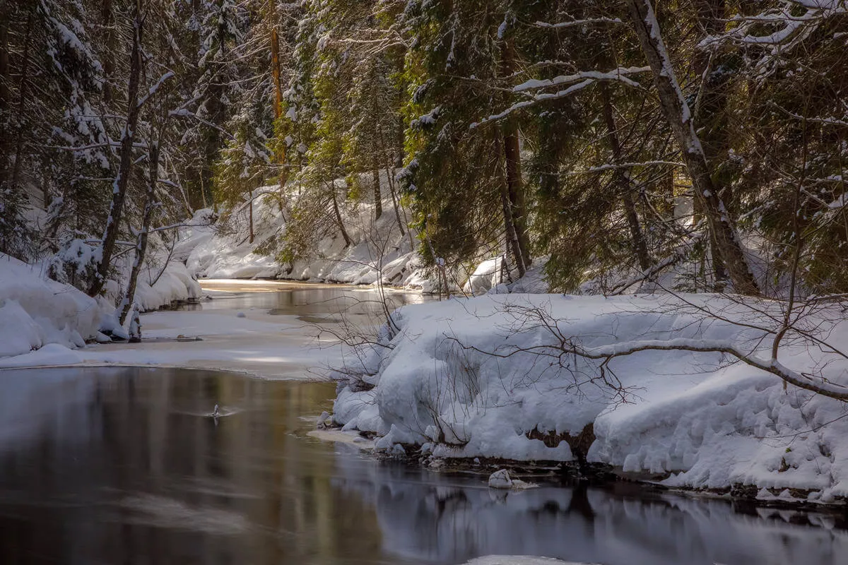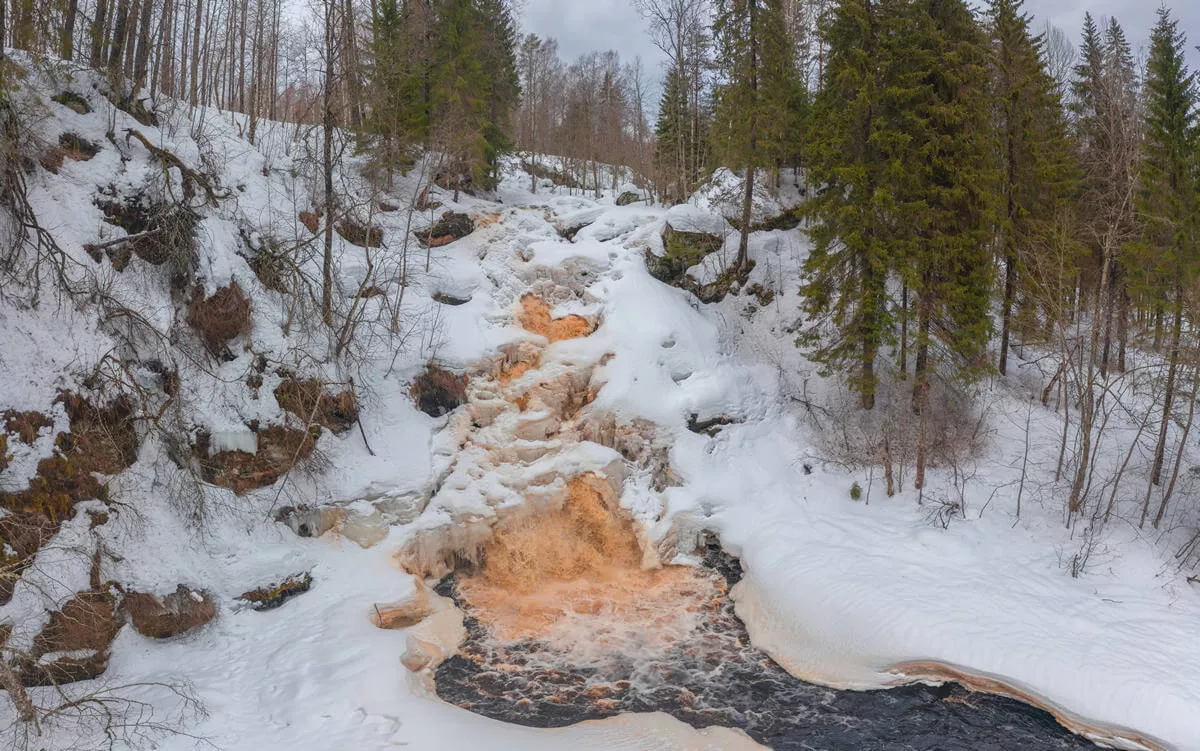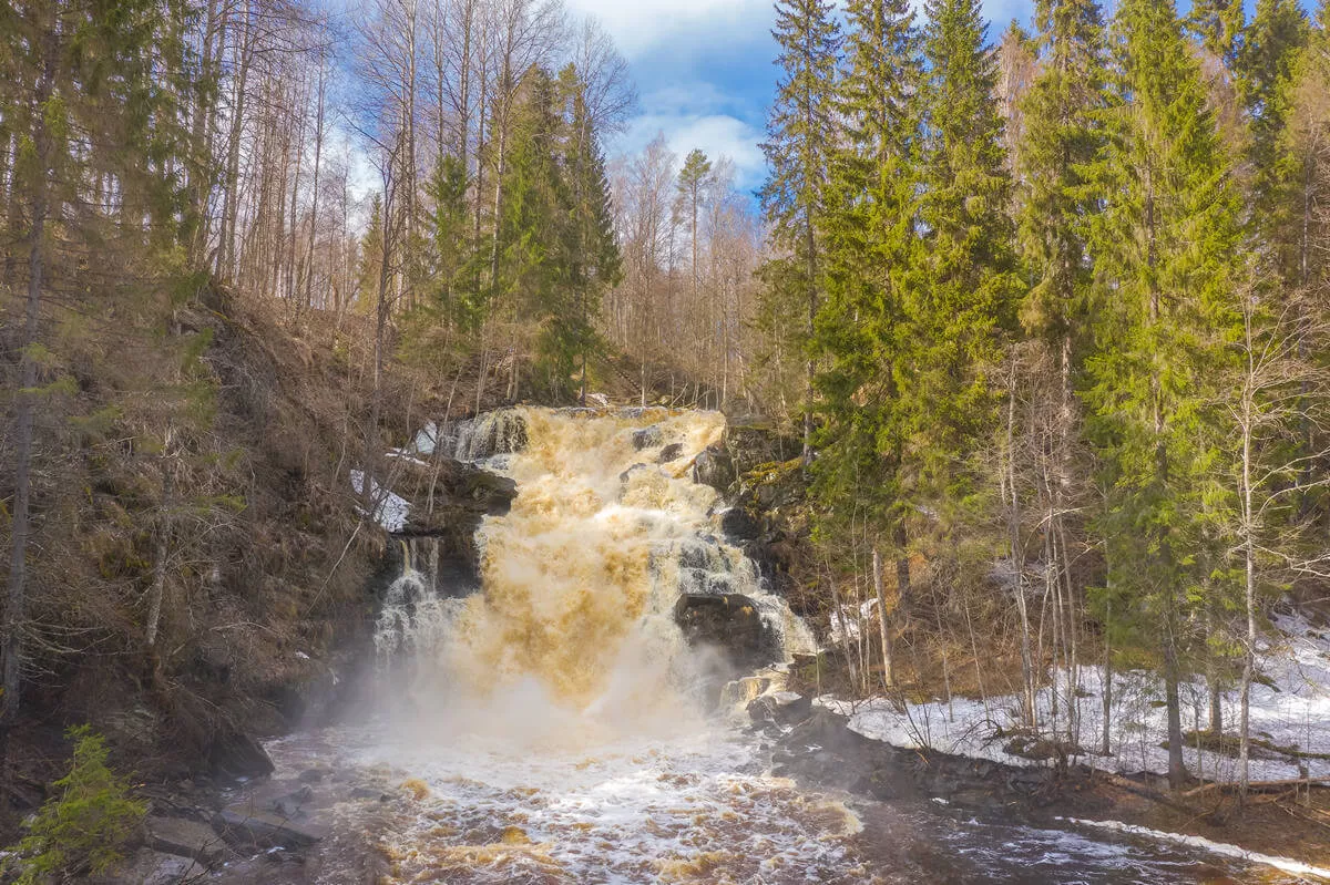 Самый высокий в Приладожье. Дорога к нему лежит через лес и занимает около 40 минут (3 км в одну сторону). Мы проедем на автомобиле столько, сколько позволит состояние дороги, а дальше прогуляемся пешком. Зимой и летом чаще всего можно доехать прямо до спуска к водопаду, а в межсезонье приходится идти 2-3 км.