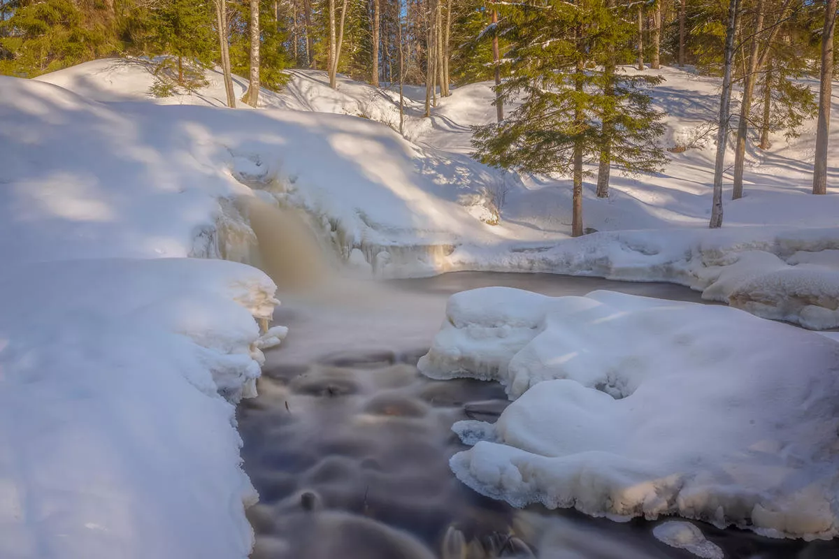 Пара каскадов на месте старой финской ГЭС. Доступен круглый год, находится прямо у дороги.