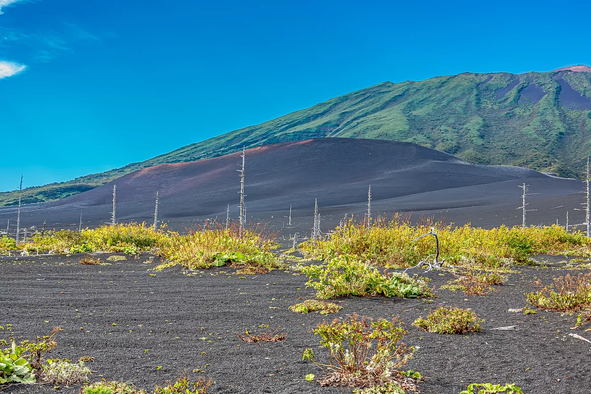 После высадки на берег мы начнем наш путь налегке через уникальный реликтовый лес. Вы увидите редчайшую островную растительность, а наши сопровождающие раскроют секреты каждого встреченного растения. Вскоре пейзаж кардинально изменится: живая зелень уступит место сюрреалистичному мертвому лесу. Вы пройдете по шлаковым полям, где среди черного пепла стоят скелеты деревьев, погибших во время мощного извержения 1973 года.