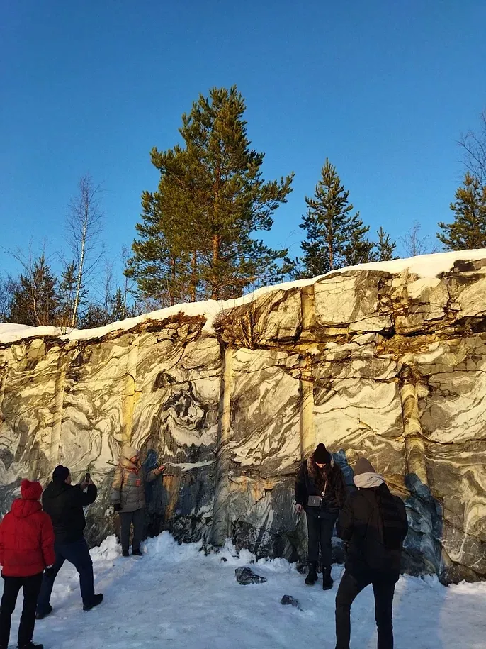 Примерно в 14:00 мы прибываем на территорию горного парка Рускеала, где нас ждет пешеходная экскурсия по мраморному каньону (1 час). Эко-тропа вокруг Рускеалы протяженностью 1,5 километра имеет множество панорамных площадок, с которых открываются виды на это уникальное место.