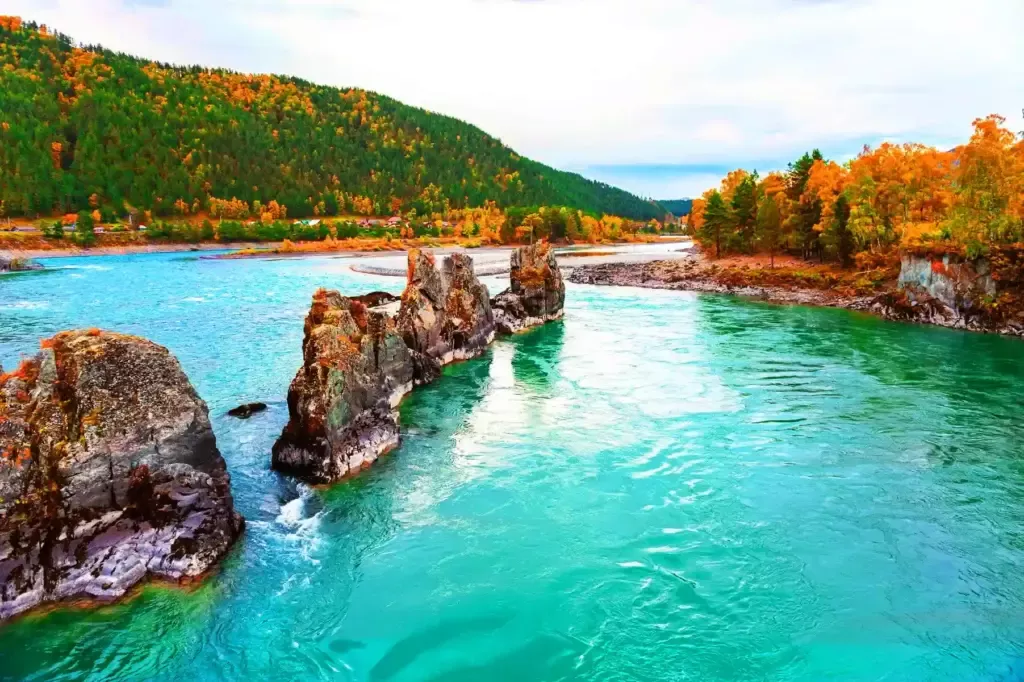 Осенью Катунь набирает свой пронзительно-бирюзовый цвет, а в лесах царит настоящее буйство красок от которого захватывает дух! Воздух уже по-осеннему чист и прозрачен, нет бесконечных потоков туристов, вокруг царит удивительное спокойствие и тишина…