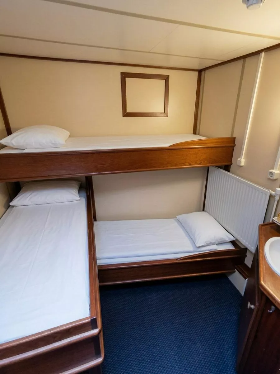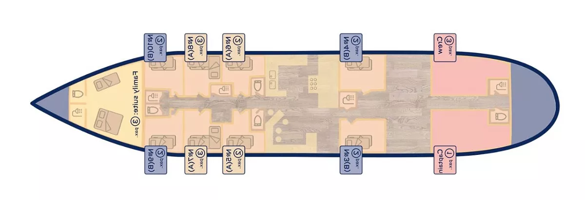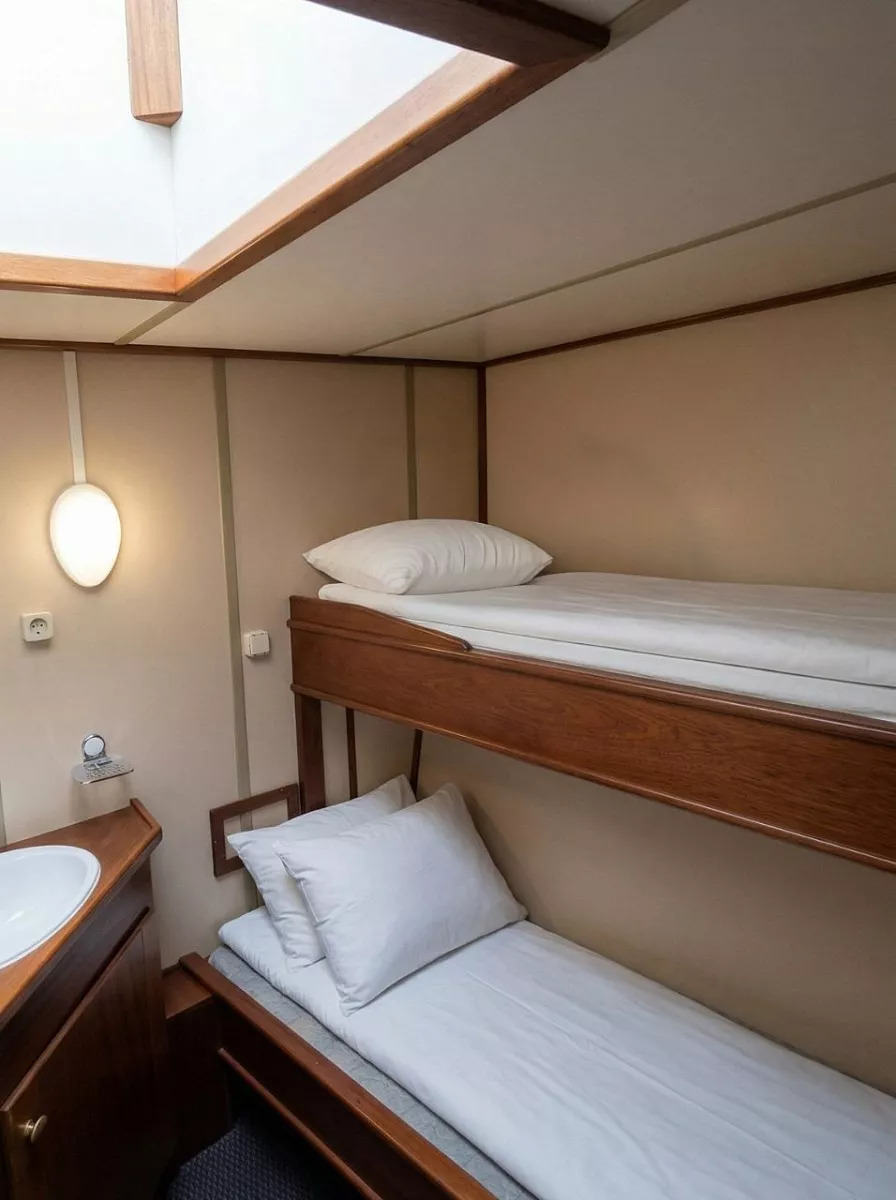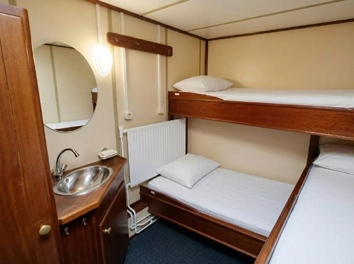 Размещение: на корабле две двухместные и две трехместные каюты класса А (каюты 5, 6, 8, 9) ,