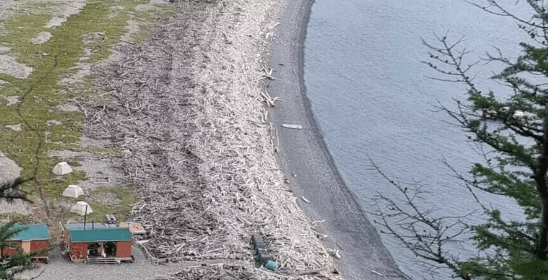 Бухта Онгочан порадует нас интересным ландшафтом: весь берег завален плавниковым лесом, периодически мимо проходят киты или косатки. -