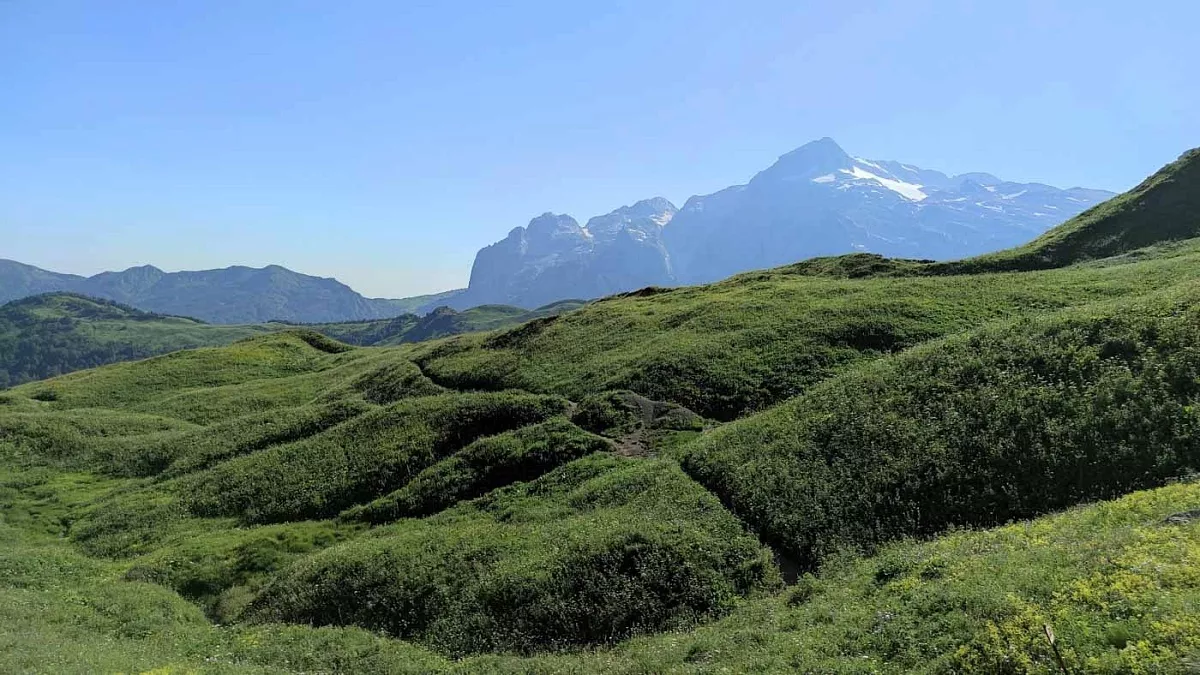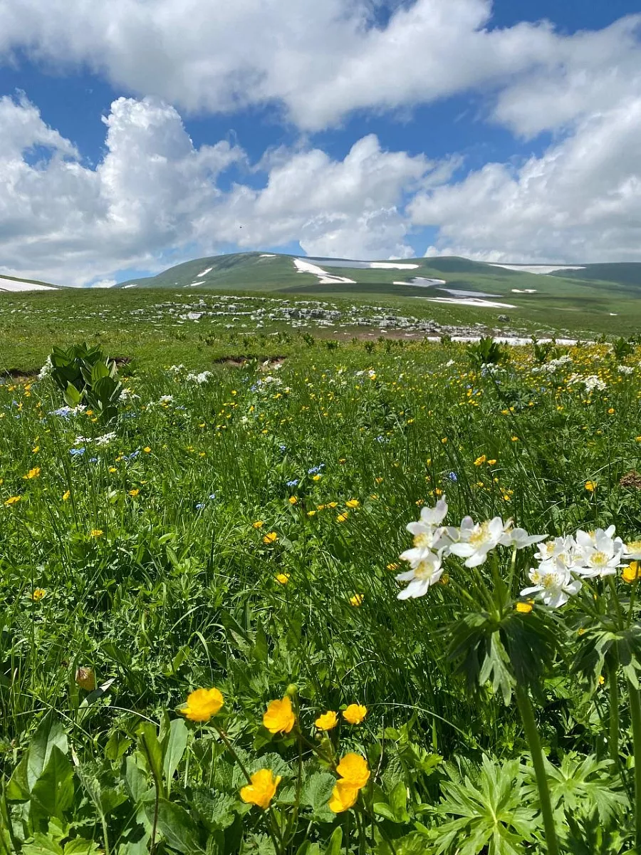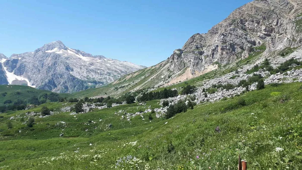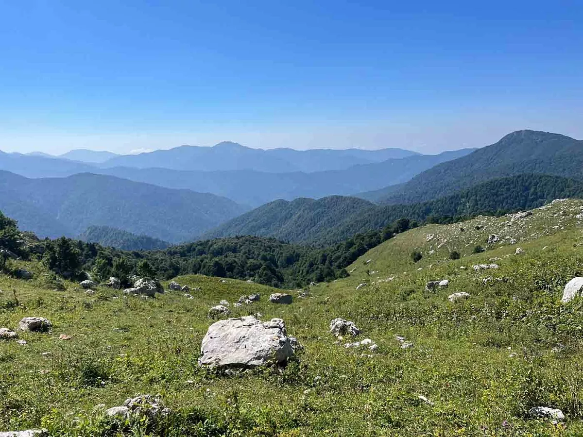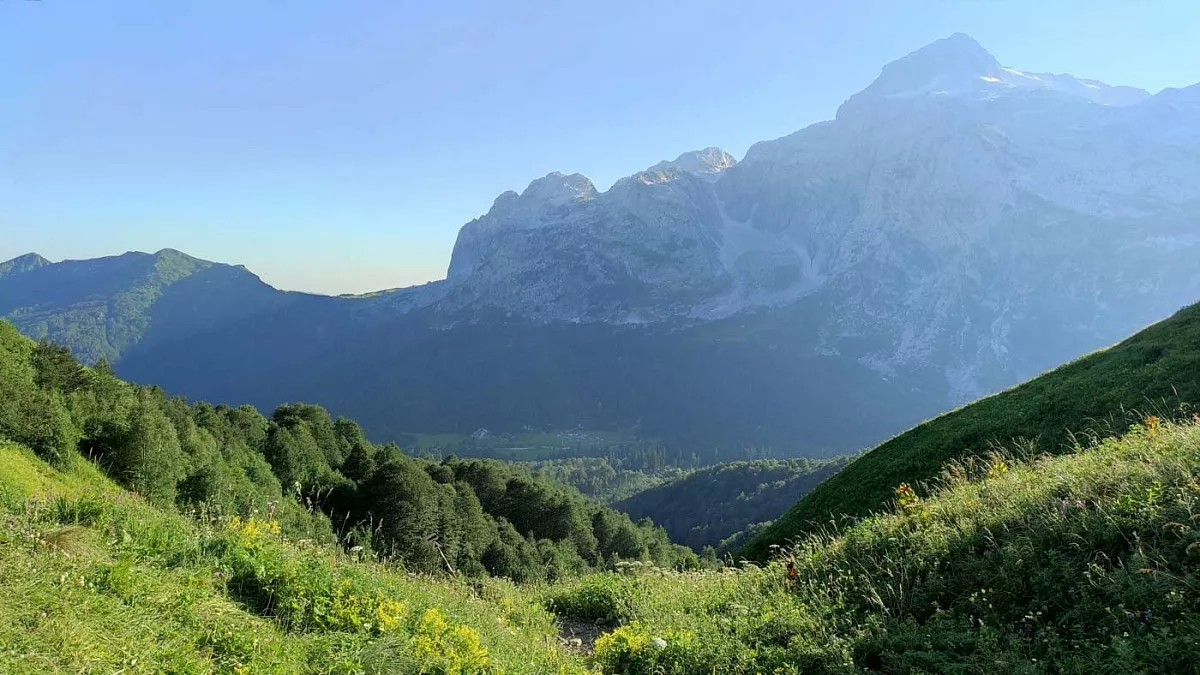 Ну вот мы и на КПП «Лаго-Наки» с этой точки начинается пешая часть маршрута, делаем общую фотографию и отправляемся в путь. Почти в самом начале пути нас ждёт смотровая площадка с потрясающим видом (Спойлер: потрясающие виды будут радовать нас бОльшую часть похода). Наша сегодняшняя цель - стоянка «Инструкторская щель», которая находится у истоков реки Армянка. Через несколько часов мы увидим величественную гору Оштен, бесполезно убирать телефон в карман, фотографировать хочется всё время!