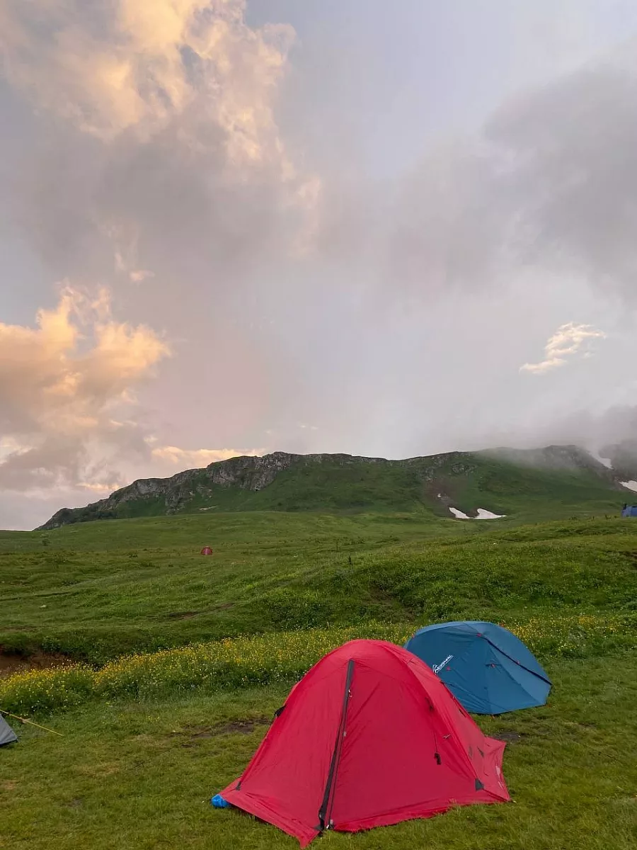 Дойдя до места ставим лагерь, и понимаем, как мы все молодцы! Сегодня будет первая ночь, когда мы увидим звёздное небо в горах, такое не забывается! Небо на равнине и в горах разное, тут прекрасно видно почему Млечный путь так называется, по небу действительно как будто разлито молоко. Сегодня первая ночёвка в палатках.