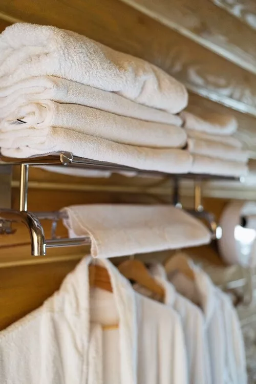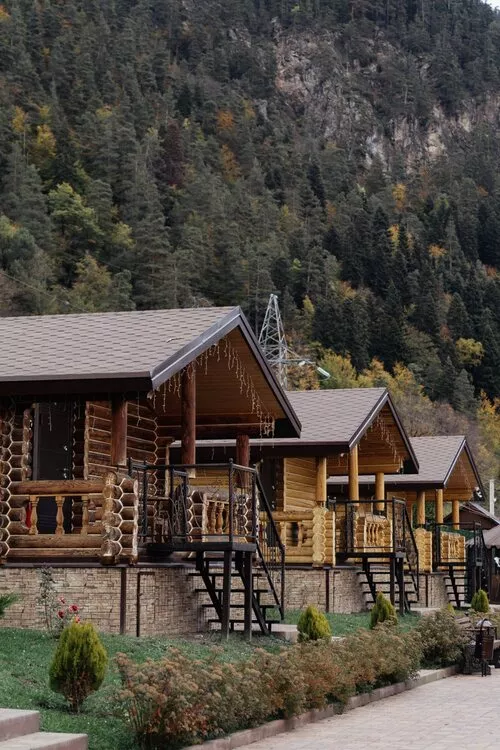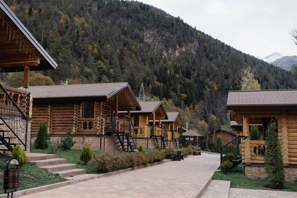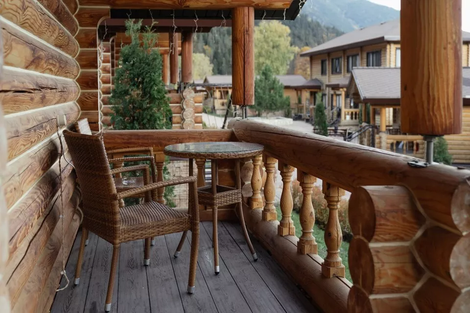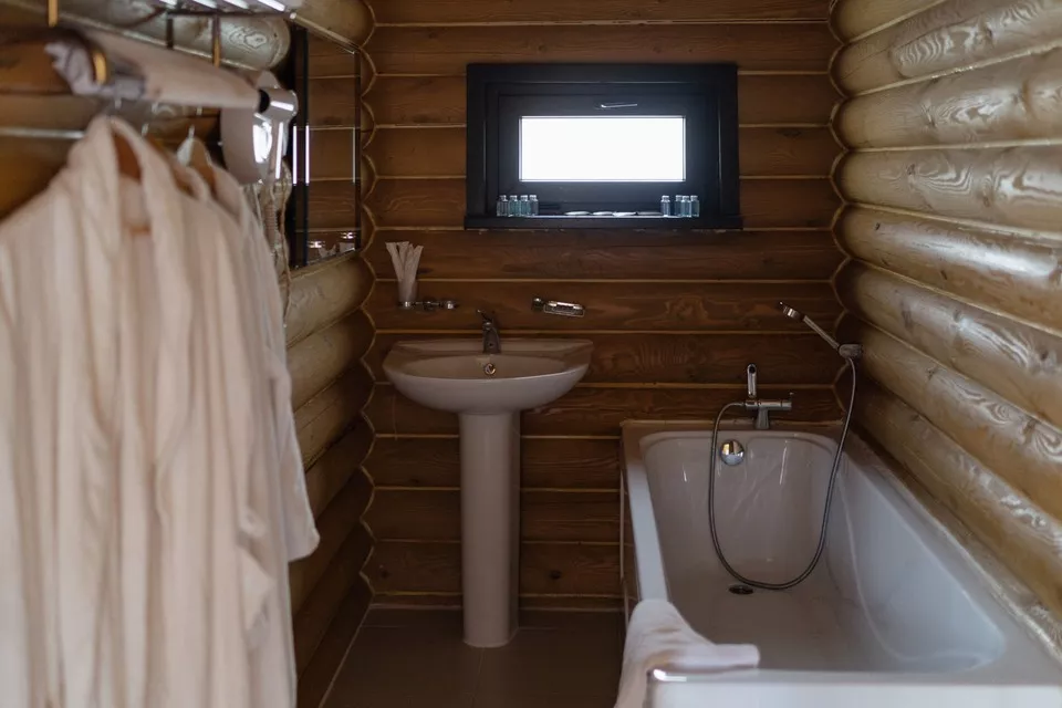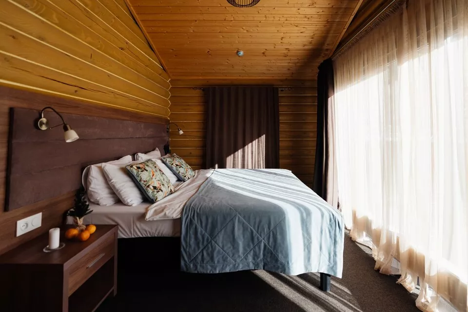 Гости размещаются в домах из бруса уровня Комфорт на территории отеля.