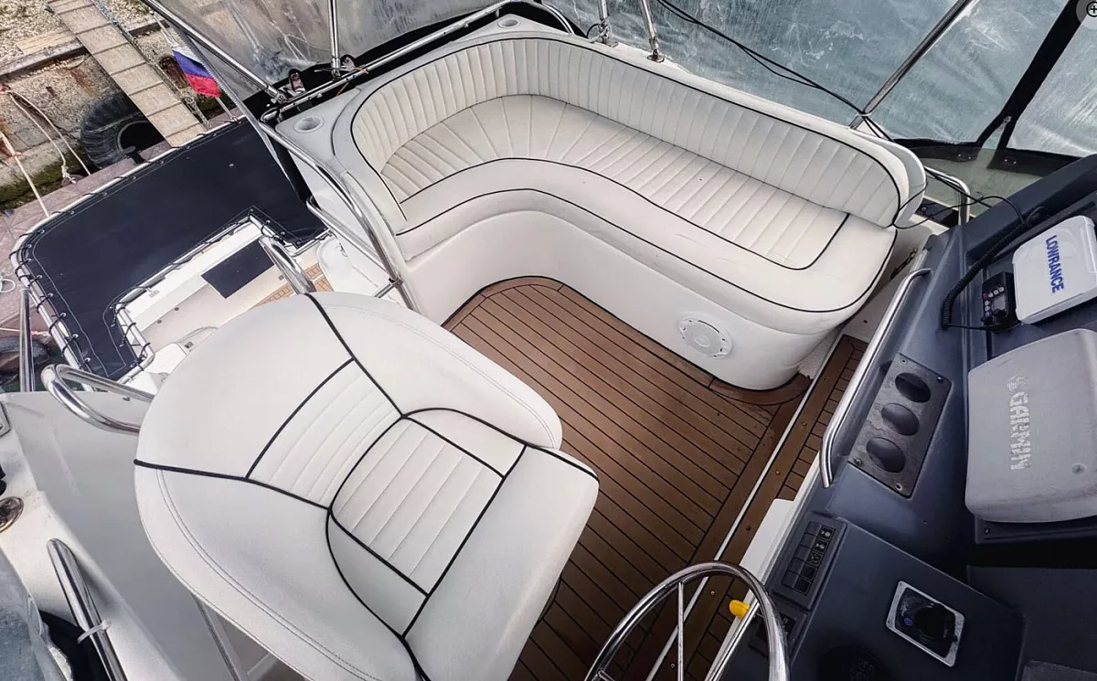 Современный катер с мягкими сиденьями, лежаками, верхней палубой.