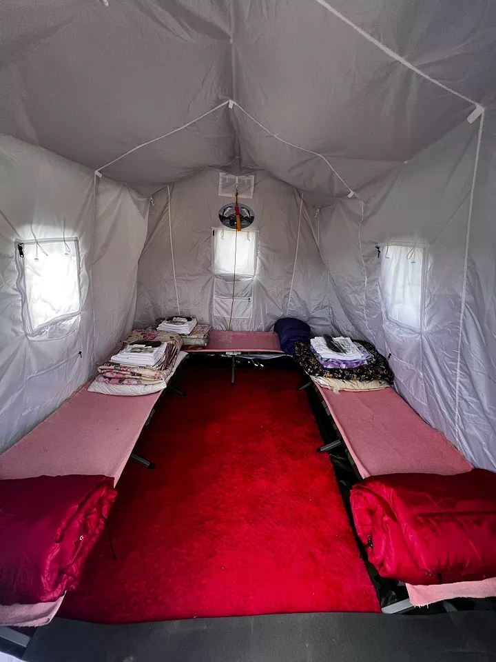 Проживание: в палаточном лагере, одна отапливаемая, утепленная палатка на двух-трех человек, в каждой палатке стол и два стула либо табуретки, раскладушки, одеяла, подушки, комплект постельного белья в том числе 3 полотенца на человека, дополнительно спальники.
