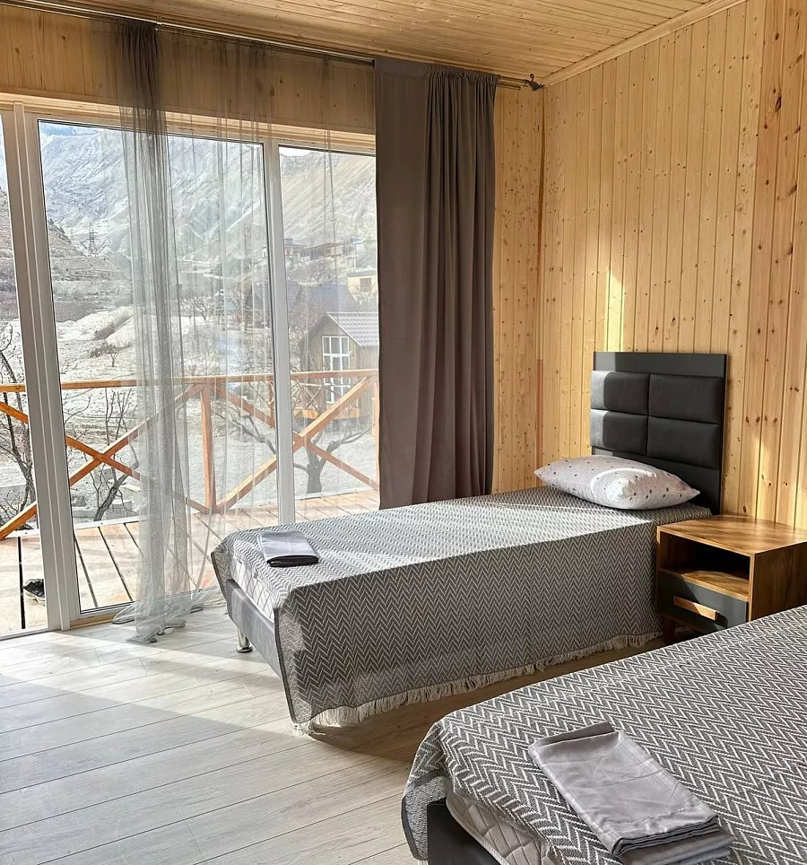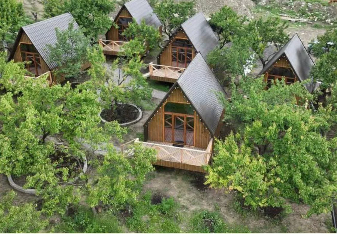 В горах (3 ночи) мы проживаем в комфортных А-фрейм домиках по 2 человека, удобства в номере. Домики находятся в абрикосовом саду.